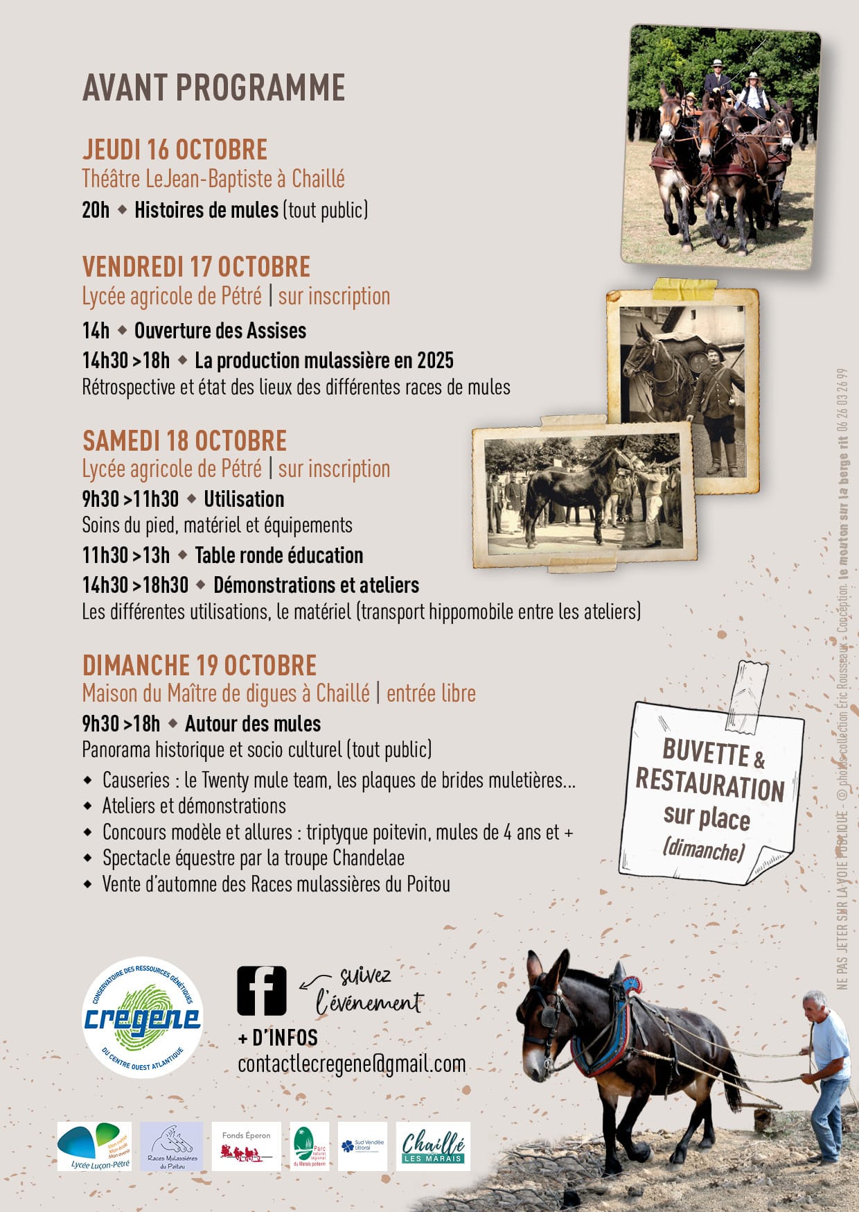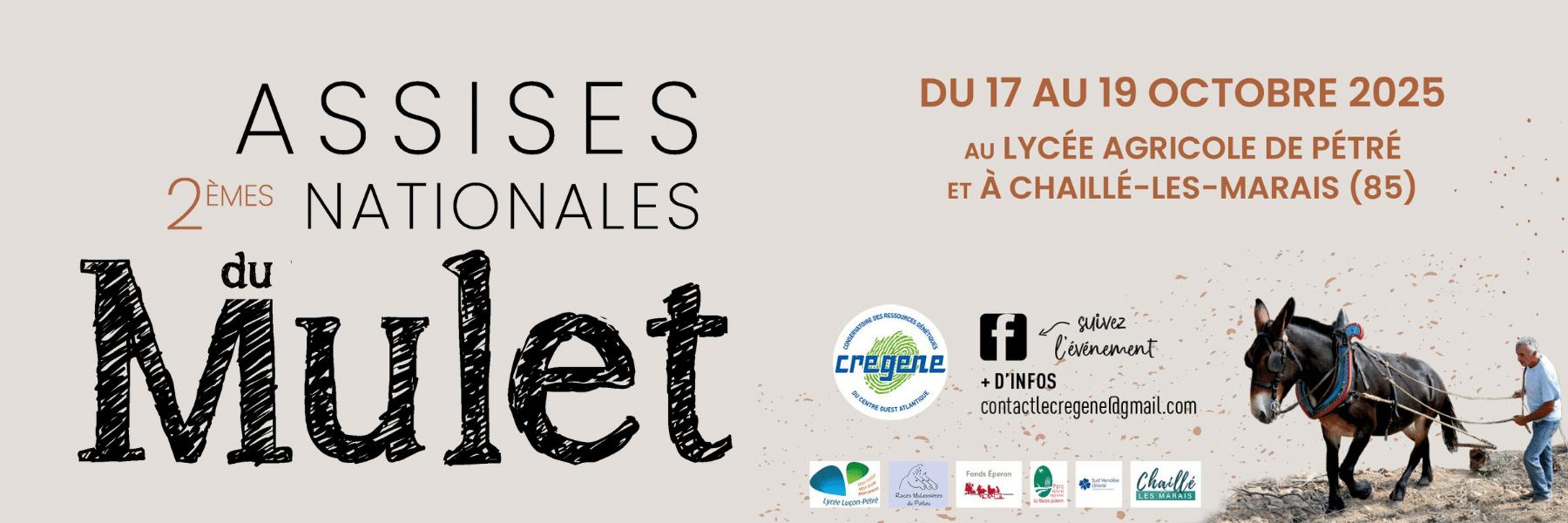 - Inscription obligatoire sur : https://www.helloasso.com/associations/cregene-conservatoire-des-ressources-genetiques-du-centre-ouest-atlantique/evenements/assises-nationales-du-mulet-2025